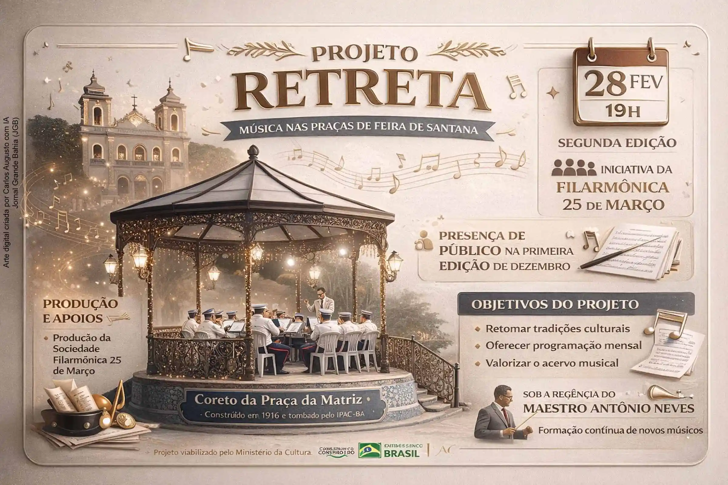 Feira de Santana, 28 de fevereiro de 2026 — Neste dia, a Filarmônica 25 de Março estará no coreto da Praça da Matriz para a segunda edição do Projeto Retreta, marcada para às 19h. Essa iniciativa visa reavivar uma tradição essencial da vida cultural da cidade. Inaugurada em dezembro, a primeira edição atraiu um público significativo e teve como objetivo restaurar as apresentações de bandas em espaços abertos, além de fortalecer os laços entre a música das filarmônicas e a memória coletiva feirense.
