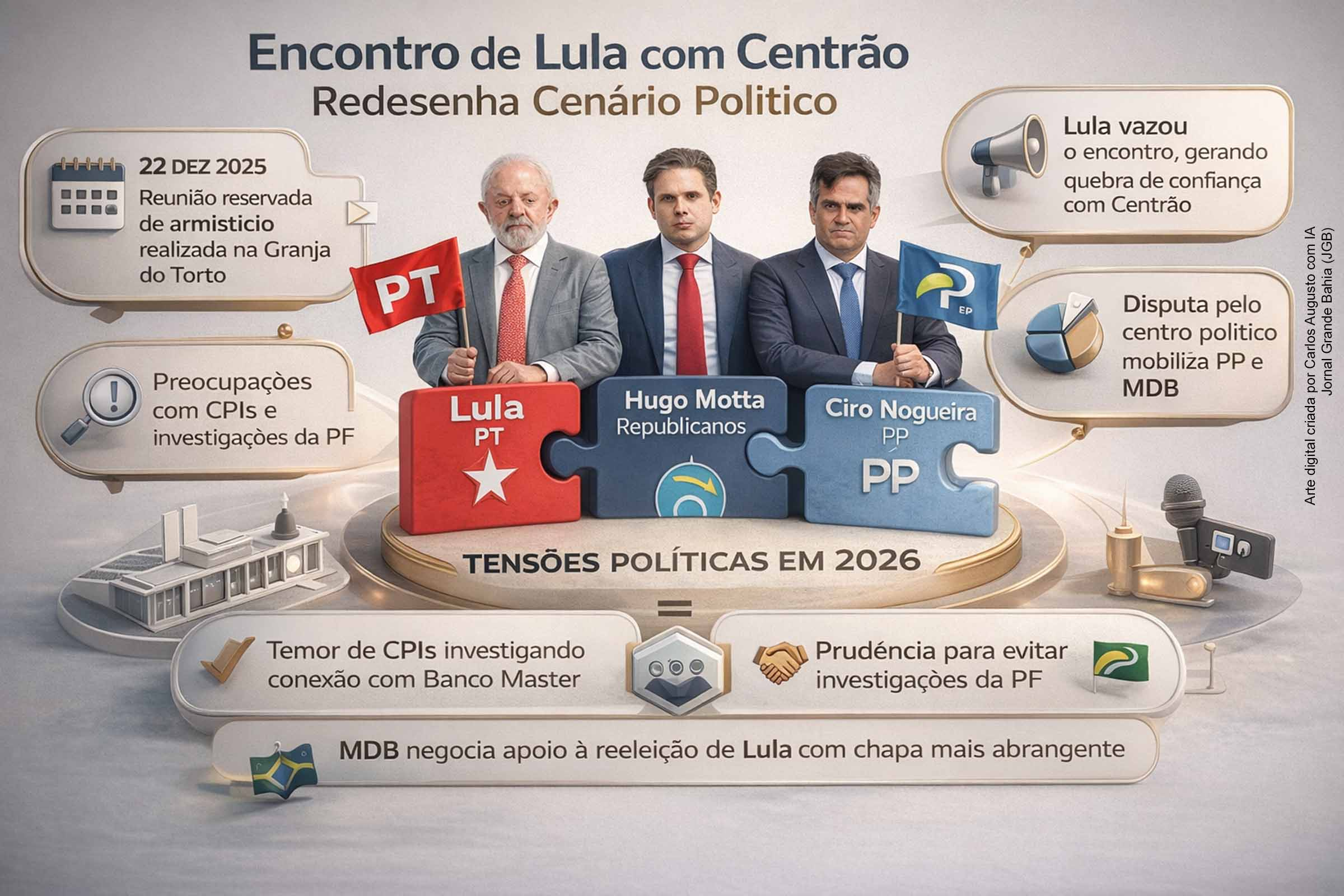Na última segunda-feira, 09 de fevereiro de 2026, Brasília foi cenário de uma reunião reservada entre o presidente Luiz Inácio Lula da Silva (PT), o presidente da Câmara, Hugo Motta (Republicanos), e o senador Ciro Nogueira (PP-PI). O encontro, ocorrido em 22 de dezembro de 2025 na Granja do Torto, teve como principal propósito amenizar as tensões políticas que cercam o ambiente eleitoral do próximo ano. Em um contexto marcado por investigações delicadas envolvendo o governo e figuras influentes do Congresso, a reunião foi vista como um armistício informal entre setores da esquerda e do Centrão, com repercussões significativas na formação de alianças e no posicionamento dos partidos para a disputa presidencial.